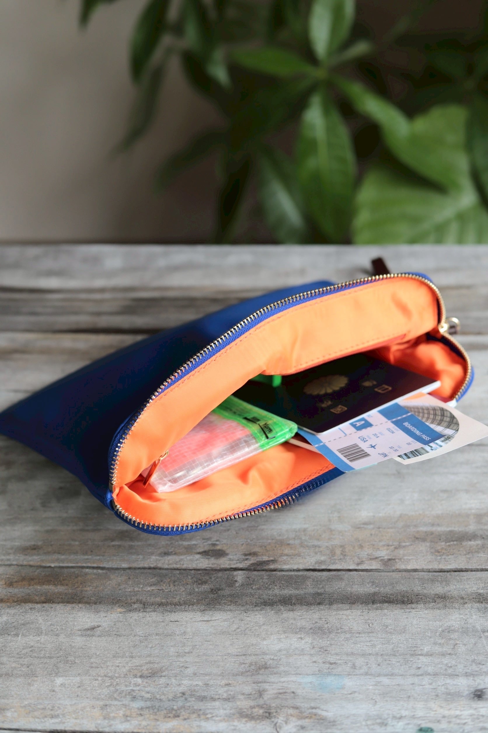 エブリデイポーチ(外側ブルー、内側オレンジ、持ち手ブラウン、金具ゴールド)